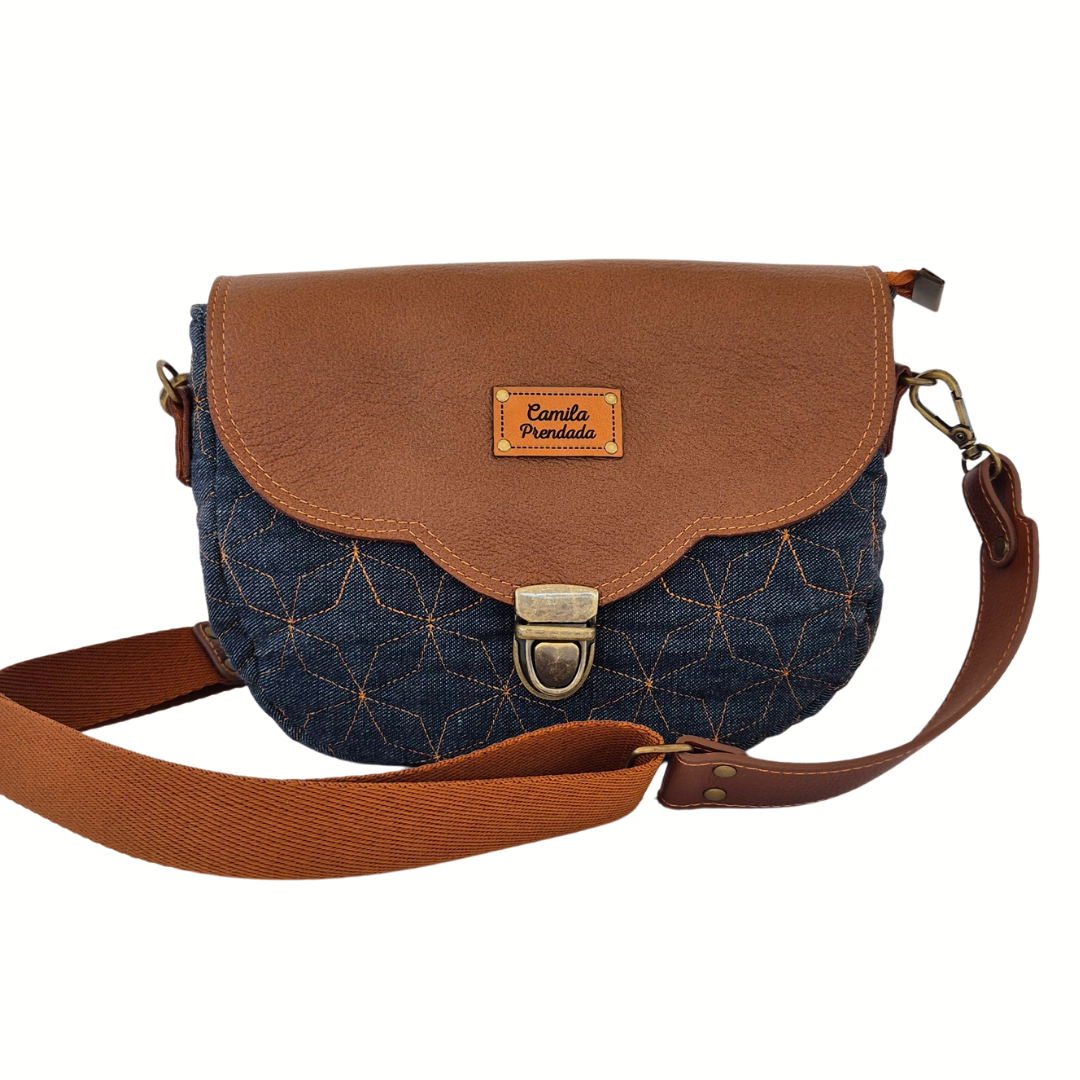 Seu corpo arredondado em jeans traz leveza e movimento ao visual, enquanto a aba em couro adiciona um toque elegante e sofisticado — um contraste lindo entre o jeans artesanal e o couro de alta qualidade.